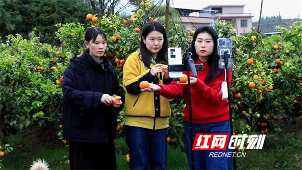 随后,记者们前往管家村,这里也是此次助农直播的暖心一站。此前,刘女士家中沃柑遇到销售难的问题,抱着试一试的心态在网上向江苏电视台记者求助,得知情况后,江苏电视台第一时间联动永州电视台,将刘女士的沃柑基地纳入此次直播助农行程。走进果园,金灿灿的沃柑挂满枝头,果香四溢,刘女士热情地带着记者们穿梭在果树间。记者们一边帮刘女士推介沃柑,一边向网友讲述背后的助农故事,暖心的情节和优质的果品让网友纷纷下单,为这份爱心与美味买单。