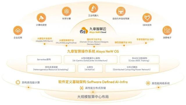 中层是九章智算操作系统 Alaya NeW OS,是工作负载的抽象与调度逻辑层,其中包括 Serverless 架构 、AI 导向的数据中心架构、多 AIDC 训练架构、异构资源调度、 AI 原生 、分布式算网。